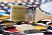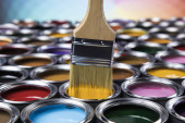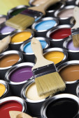 Metalowe puszki z farbą i pędzlem