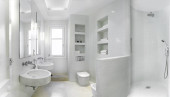 Czyste jasne wnętrze łazienki z lustrem, wanną, białym zlewem i marmurową płytką. Oryginalna przestrzeń hotelowa z nowoczesnymi elementami