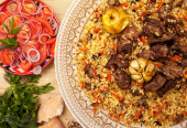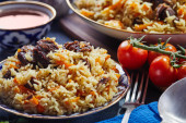 uzbecki pilaf w autentycznym niebiesko-złotym naczyniu, nakręcony na niebieskim tle z pomidorami, czosnkiem i herbatą