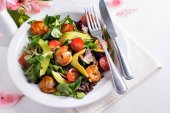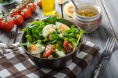 Śniadanie wegetariańskie z komosą, jajka, mikrozielone i warzywa, zielona herbata z miętą na białym stole, płaska nioska