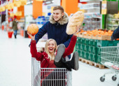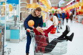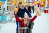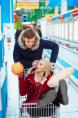młody przystojny facet jeździ a dziewczyna w a supermarket w w w wózek