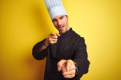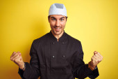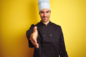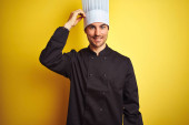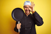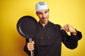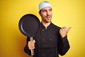 Młody kucharz noszący mundur i kapelusz trzymający patelnię kucharską na odizolowanym żółtym tle ze szczęśliwą twarzą stojącą i uśmiechniętą z pewnym uśmiechem pokazującym zęby
