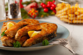 Zdjęcie "Świąteczny karp, smażone karpie plasterki ryb na ceramicznym talerzu na świątecznym stole, zbliżenie. Tradycyjne danie wigilijne. Polskie święta" może być wykorzystywane do celów osobistych i komercyjnych zgodnie z warunkami zakupionej licencji Royalty-free. Obraz jest dostępny do pobrania w jakości wysokiej rozdzielczości do 5760x3840.