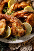 Świąteczny karp, smażone karpie plasterki ryb na ceramicznym talerzu na świątecznym stole, zbliżenie. Tradycyjne danie wigilijne. Polskie święta
