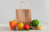 Papierowa torba z różnym zdrowym jedzeniem na ciemnym tle. Zakupy żywności supermarket i koncepcja planu odżywiania