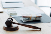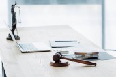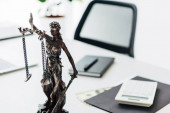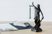 złote łuski sprawiedliwości na drewnianym stole na czarnym tle