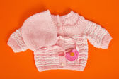 słodkie dziewczynki w fioletowy strój siedzi i ze zdziwieniem patrzy. na białym tle
