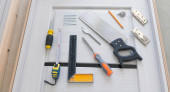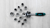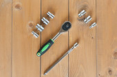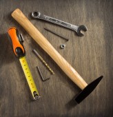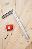 miernik taśmy i narzędzie na desce drewnianej deski