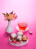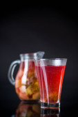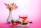 szkło z galaretką, łyżką, serwetka i wazon z kwiatami na Obrus