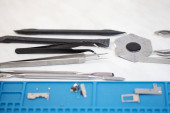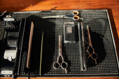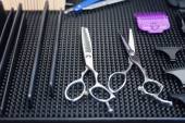 widok z bliska nożyczek i narzędzi fryzjerskich w miejscu pracy