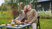 Kobieta patrzy na mężczyznę, śmieje się i strzela szklankami
