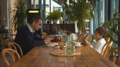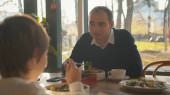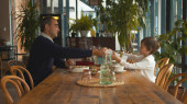 Romantyczna kolacja, facet mówi toast i stukają szklankami