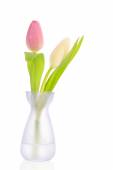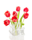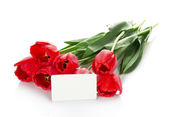 czerwone tulipany w wazonie i puste karty, na białym tle