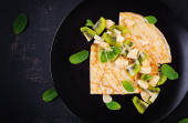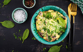 Ketogenic, paleo dietetyczne śniadanie. Omelette ze szpinakiem i awokado, ogórek. Widok z góry, przestrzeń kopiowania