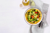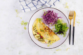 Zdjęcie "Ketogenic, paleo dietetyczne śniadanie. Omelette ze szpinakiem i awokado, ogórek. Widok z góry, przestrzeń kopiowania" może być wykorzystywane do celów osobistych i komercyjnych zgodnie z warunkami zakupionej licencji Royalty-free. Obraz jest dostępny do pobrania w jakości wysokiej rozdzielczości do 5760x3840.