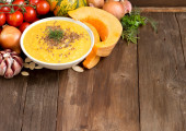 Pikantna zupa dyniowa z pieczoną papryką, chili, czerwoną cebulą i czosnkiem w ceramicznej misce na drewnianym stole, przyprawiona śmietaną i bazylią.