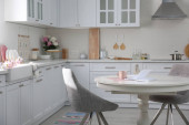 Nowoczesne wnętrze kuchni ze stylowym drewnianym stołem