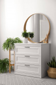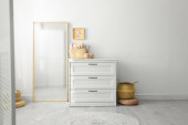 Stylowe wnętrze pokoju z szufladami i okrągłym lustrem