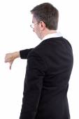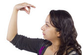 Gigantyczna kobieta trzymająca małego biznesmena jako metaforę utraty pewności siebie. Mężczyzna czuje się bezbronny i bezbronny na białym tle.