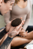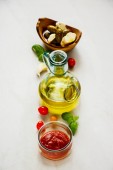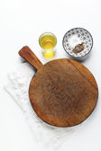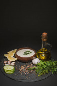 Tradycyjny grecki tzatziki sos z oliwą z oliwek i składników na ciemnej tablicy na czarnym tle