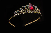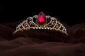 złota korona z rubinami i perłami na czarnym jedwabiu