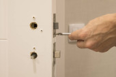 Zdjęcie "Człowiek naprawiający klamkę. zbliżenie rąk pracownika instalowanie nowej szafki drzwiowej" może być wykorzystywane do celów osobistych i komercyjnych zgodnie z warunkami zakupionej licencji Royalty-free. Obraz jest dostępny do pobrania w jakości wysokiej rozdzielczości do 5760x3840.