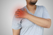 Azjatycki grubas z bólem barku, izolowany na białym backgound.