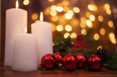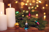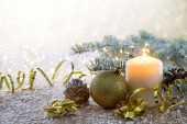 Złota świąteczna piłka na gałęzi drzewa, biały płomień świecy z gwiazdami bokeh światła na brązowym tle