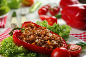 chili corn carne - tradycyjne potrawy meksykańskie, na białym talerzu, serwetka, na białym tle