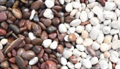 Kolorowe kamyki okrągłe morski czarny, biały, żółty wielokolorowe w świetle słonecznym. Projektant abstrakcyjne tło. Kolorowe kamyki na plaży zbliżenie.