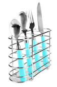 nóż, widelec i łyżki w metalowy stojak na białym tle