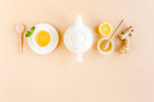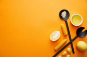 Widok z góry chochli, łyżki z oliwą z oliwek i przypraw na tle marmuru