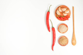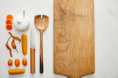 Widok z góry drewniana łyżka z nożem i warzywami na marmurowym tle