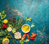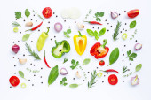 Widok z góry warzyw ekologicznych i świeżych ziół z przyprawami na żółtym tle