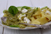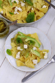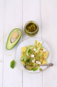 Makaron z serem, awokado i pesto na białym talerzu
