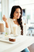 młoda kobieta z jej ciastko w kawiarni pomieszczeniu zadowolony
