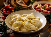 Pierogi świąteczne wypchane leśnymi grzybami i kapustą na białym talerzu na świątecznym stole. Tradycyjne danie wigilijne w Polsce