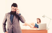 Zasobów ludzkich dla biznesu. Menedżer zasobów ludzkich po rozmowy kwalifikacyjnej. Sexy wywiad z kandydatem w biurze kadr. Trener kadry myśląc o pracy wnioskodawcy w pierwszym planie