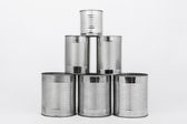 Grupa srebrnych konserw żywności na białym tle.