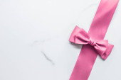 Różowa wstążka jedwabna i łuk na marmurowym tle, baby shower