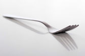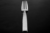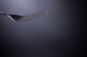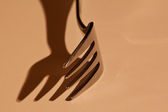 Widelec obiadowy rzuca duży, wydłużony cień na szklane tło stołu. Koncepcja Cienia i Światła
