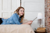 Kobieta w średnim wieku odpoczywa w domu. pani zrelaksowany na łóżku używa jej telefon, social network koncepcja
