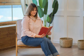 Młoda kobieta czyta książki na kanapie w salonie. zrelaksowana dziewczyna w ciepłym swetrze odpoczywająca z książką w rękach