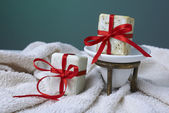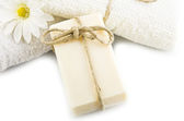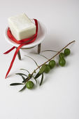 oliwne mydła ręcznie robione z gałązką oliwną i ręcznik, w prezencie.