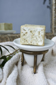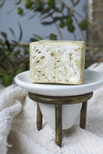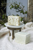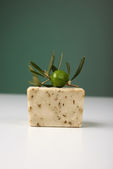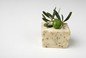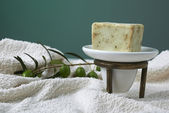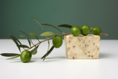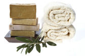 oliwne mydła ręcznie robione z gałązką oliwną i ręcznik.