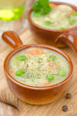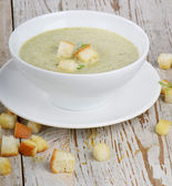 cukinia pikantna zupa z grzankami w filiżance, widok z góry