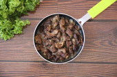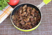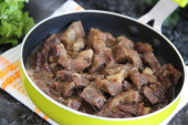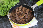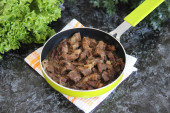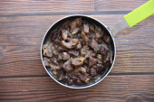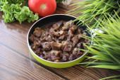 Duszona wołowina w małych kawałkach z cebulą na małej zielonej patelni