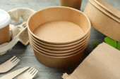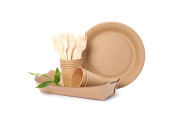 Eco - przyjazna zastawa stołowa i papierowa torba izolowana na białym tle