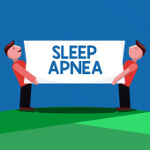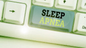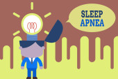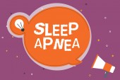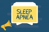 Znak tekstowy pokazujący bezdech senny. Koncepcyjne zaburzenie zdjęcia, które demonstrując wielokrotnie przestać oddychać podczas snu Mówiąca trąbka na lewym dole i papier dołączony do prostokątnego tła.