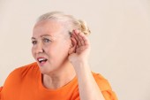 Stara kobieta wprowadzenie rękę do jej ucha. Bad słuchu
